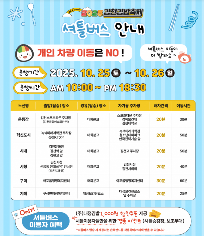 김천김밥축제는 접근성이 매우 뛰어납니다. KTX 김천(구미) 역에서 직지문화공원까지는 차량으로 약 15분 거리이며, 축제 기간 동안은 무료 셔틀버스가 운행됩니다. 더불어 셔틀버스 이용자를 대상으로 대정김밥 할인권과 경품 이벤트를 따로 준비되어 있습니다. 또한 김천시내 주요 버스노선이 직지문화공원 앞을 경유하며, 자가용 방문객을 위한 임시 주차장도 공원 인근에 다수 마련되어 있습니다. 축제 조직위원회는 원활한 교통 운영을 위해 실시간 교통안내, 주차 유도요원 배치, 휠체어 이용객을 위한 특별 이동 지원서비스도 제공합니다. 관광객이 불편함 없이 김천을 즐길 수 있도록 세심한 배려가 돋보입니다.