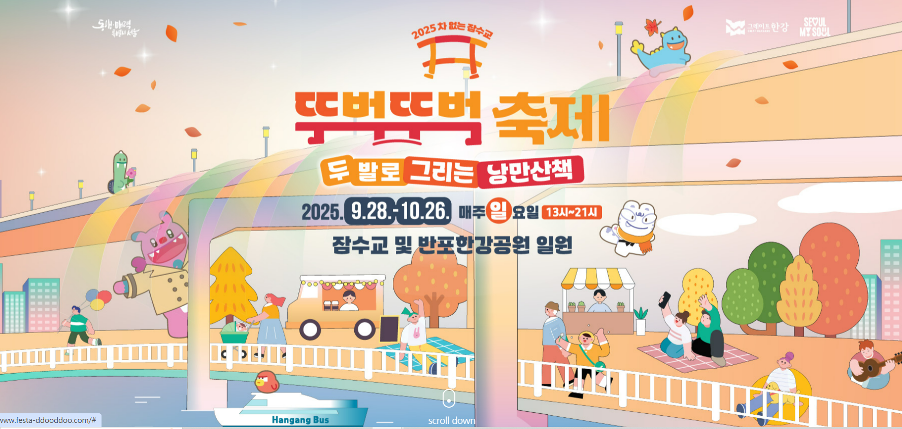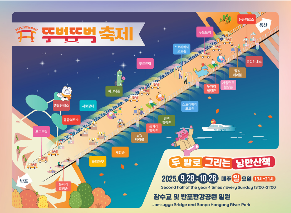 잠수교 위를 걷는 발걸음이 단순한 이동이 아닌 하나의 추억으로 남을 수 있도록, 뚜벅뚜벅 축제는 올가을에도 시민 여러분을 기다리고 있습니다.